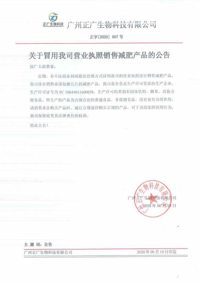 關(guān)于冒用我司營業(yè)執(zhí)照銷售減肥產(chǎn)品的公告